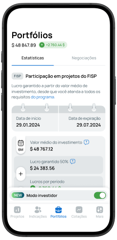 FISP investments are designed for a 6-month term. During the first 6 months of trading, the guaranteed profit is at least 50% of the invested funds. After the first 6 months, the program can be extended for another 6-month period, during which the guaranteed return will be 15%.